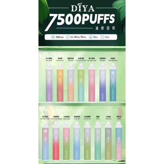 DIYA 7500 Puffs 以超高CP值席捲市場,結合 7500口大容量13ml油倉 與 650mAh可充電電池,提供穩定濃郁的煙霧與15種人氣口味。無論你是新手還是老鳥,這款一次性電子菸都能輕鬆滿足你的需求!